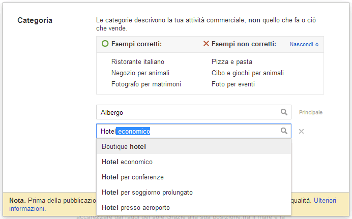 4. Google ti chiederà di stabilire la categoria della tua azienda, dandoti anche dei suggerimenti. All’interno della macro-categoria “esercizio pubblico – struttura ricettiva” specificherai se Appartamento vacanze, Agriturismo, Residence, Bed and breakfast, etc. Non avere paura di scegliere categorie specifiche invece che generiche.