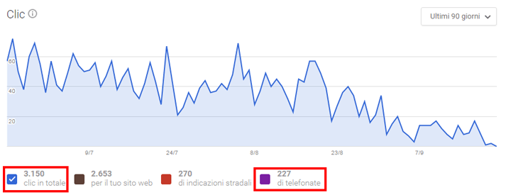 Nella dashboard, ovvero nel pannello di controllo da cui gestisci la tua scheda Googly My Business, hai accesso alle analytics. Quante telefonate hai ricevuto, i clic ottenuti, le indicazioni stradali ricercate, etc.